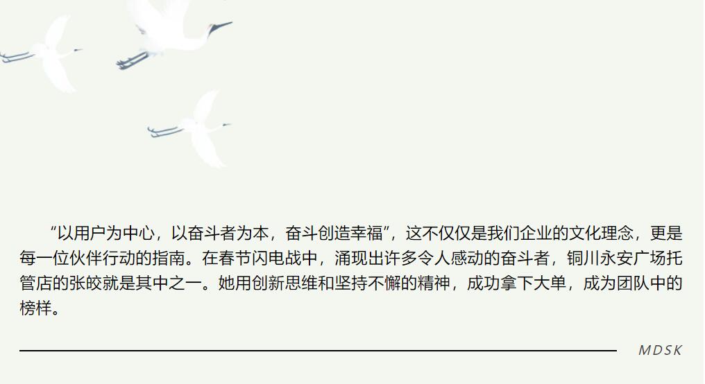 “以用户为中心,以奋斗者为本,奋斗创造幸福”,这不仅仅是我们企业的文化理念,更是每一位伙伴行动的指南。在春节闪电战中,涌现出许多令人感动的奋斗者,铜川永安广场托管店的张皎就是其中之一。她用创新思维和坚持不懈的精神,成功拿下大单,成为团队中的......【点击详情】